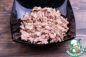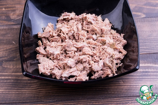 • Говядину мелко порезать и немного растрепать вилкой на волокна.