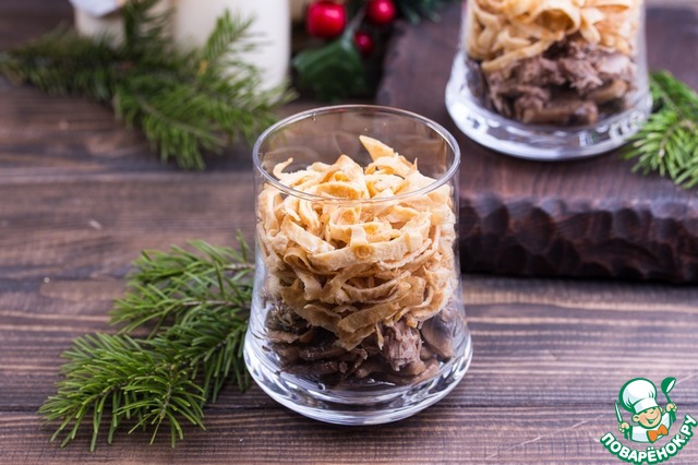 • В фужер выложить слоями шампиньоны, говядину, майонез, блинчики. Можно заранее перемешать салат и дать немного постоять, тогда он будет еще вкуснее.