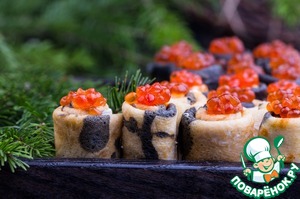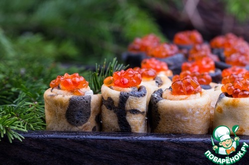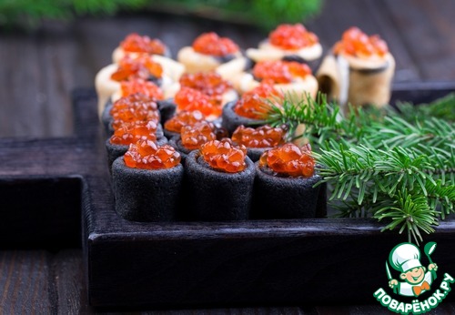 Эта закуска в стиле традиционных русских блинов с икрой, с добавлением небольшой морской нотки. Ну, и внешний вид такой закуски никого не оставит равнодушным.