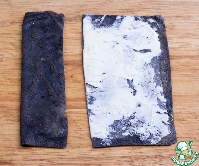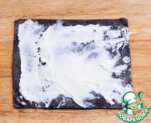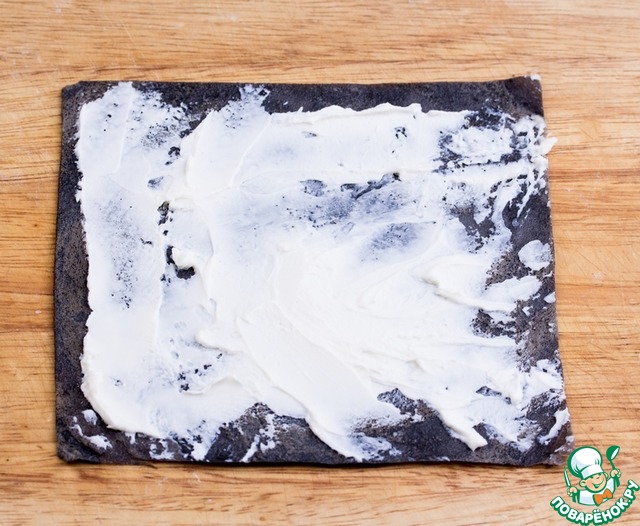 У каждого блинчика обрезать неровные края, придавая форму квадрата. Смазать тонким слоем творожного сыра. -