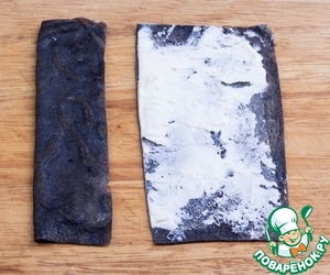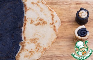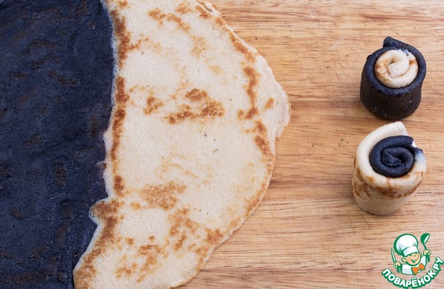Можно приготовить двухцветные блинчики, налив сначала на половину сковороды тесто одного цвета и на вторую сразу же налить тесто другого. Формировать блинчики сначала черной стороной внутрь, потом белой.
