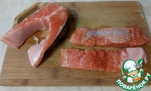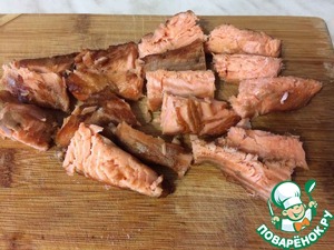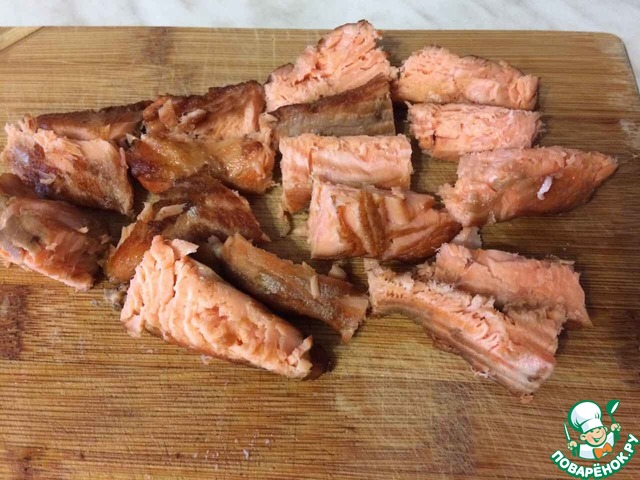 Остывшую форель, опять таки аккуратно, острым ножом режем брусочками. Главное рыбу не пробовать, иначе до бутербродов не дойдет, ну уж очень она вкусная!