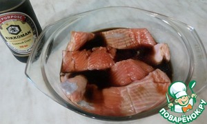 Теперь складываем нашу рыбу в посуду для маринования и заливаем соевым соусом. Я использовала натурально сваренный соус Kikkoman. Всем известно, что форель вкусная рыба сама по себе, но соевый соус только подчеркивает ее вкус. Больше никаких специй не нужно! Ставим рыбу в холодильник на ночь.