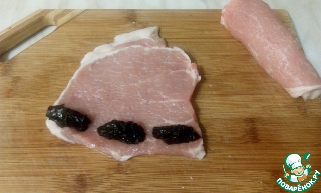 На отбитое мясо кладем чернослив и заворачиваем в рулетик.