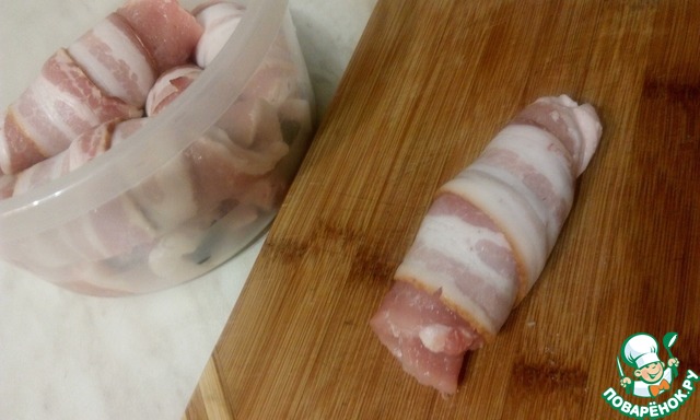 Теперь обматываем беконом и укладываем в емкость для маринования в один слой.