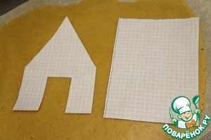 Включить духовку. Раскатать тесто не тоньше 3 мм, вырезать фигуры, перенести на противень. Я собирала домик при помощи ленточек, поэтому соломинкой для коктейлей сразу нужно прорубить дырочки для завязок в заготовках. -