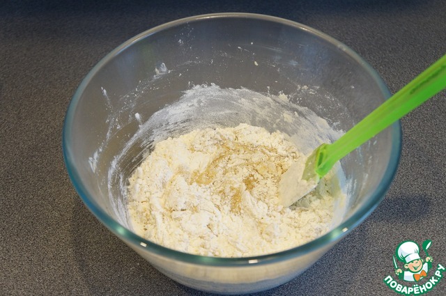Небольшими партиями всыпать муку, размешивая сначала лопаткой, потом рукой. Скатать тесто в шар, разделить на две части, каждую завернуть в пакет или плёнку и убрать в холодильник на час минимум.