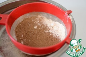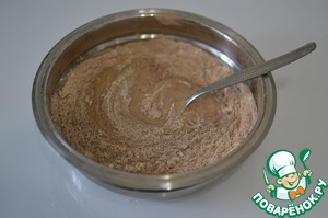 В отдельной посуде смешиваем сухие ингредиенты: имбирь, корицу, какао-порошок, пищевую соду и 100 г просеянной муки.