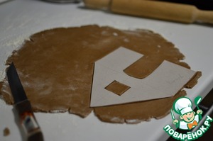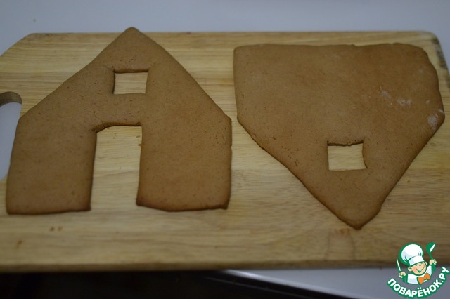 Из картона нужно вырезать заготовки для пряничного домика. Можно найти на просторах интернета уже готовые шаблоны или придумать модель самостоятельно. Достать тесто из холодильника, раскатать, вырезать нужные фигуры для домика по шаблону. Выпекаем составляющие домика порядка 8-10 минут при 180 градусах.