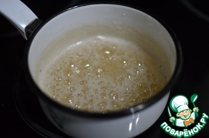 Склеивать части дома будем с помощью карамели. Для ее приготовления сахар смешиваем с водой. Помешивая, доводим до кипения на среднем огне. Продолжая помешивать, варим сладкую смесь до получения золотистого цвета.