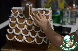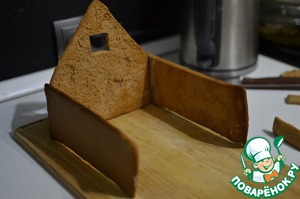 Когда все составляющие детали будут полностью готовы, приступаем к «сборке» пряничного домика. Окунаем части домика торцом в горячую карамель и быстро скрепляем между собой. Сначала склеиваем боковую стену и фасад, потом прикрепляем вторую боковую сторону и заднюю стенку дома. Работать нужно быстро, так как карамель очень быстро застывает. В самую последнюю очередь крепим крышу. Оставляем сформированный домик примерно на час.