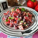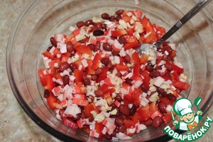 Режем небольшими кубиками крабовые палочки и болгарский перец тонкими полосками, добавляем к фасоли.