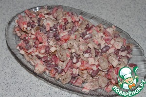 Сливаем жидкость с фасоли и высыпаем фасоль в миску, где будем собирать наш салат.