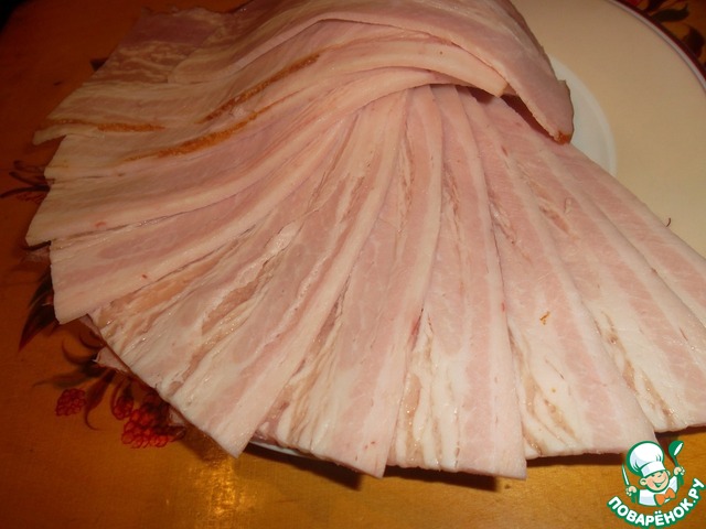 Копченую грудинку "распускаем" тонкими полосами вдоль куска. Шкурку срезаем. Сверху куска обычно есть такая себе подкопченная "корочка" - поскольку она довольно мягкая, то ее можно не удалять...