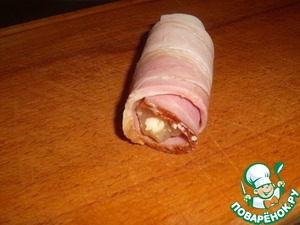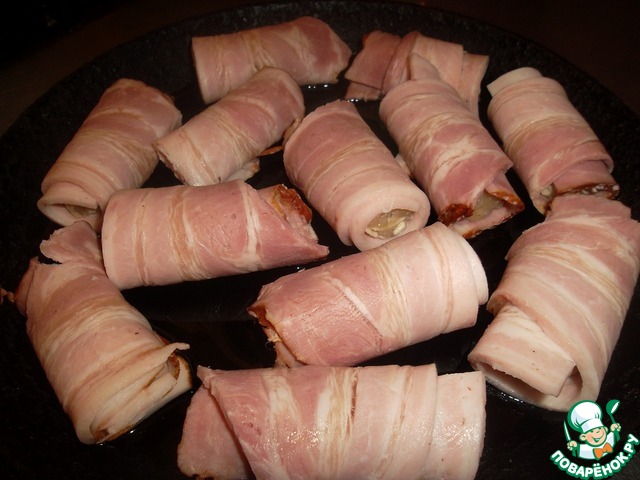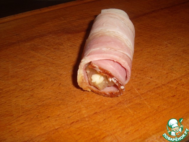 Мокрыми руками формируем не большие удлиненные "котлетки". Выкладываем их на полоску грудинки...