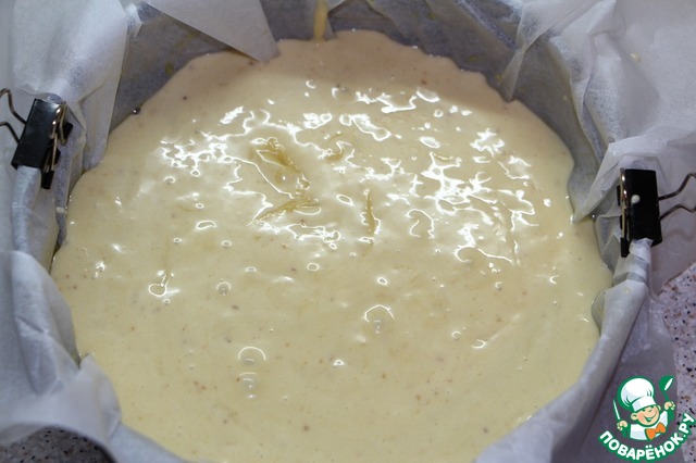 Добавить белки, аккуратно перемешать лопаткой снизу вверх. Жаропрочную форму диаметром 22 см. выстелить пергаментом. Бока по пергаменту смазать растительным маслом. Перелить тесто в форму.