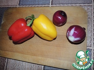 Берем две шт. Болгарского мясистого перца, две шт. средних красного лука, можно заменить обычным, главное посочнее и послаще. -