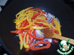 В раскаленную сковороду наливаем оливковое масло, выкладываем лук с перцем и добавляем 1 cт. л. сахара.