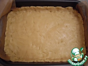 Тесто слегка раскатайте, уложите в противень и разровняйте.