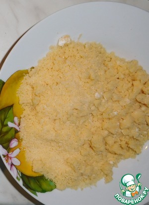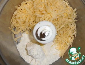 Масло, соль, муку и, натертый на мелкой терке, сыр отправляем в комбайн и перетираем до крошки (можно это сделать руками).