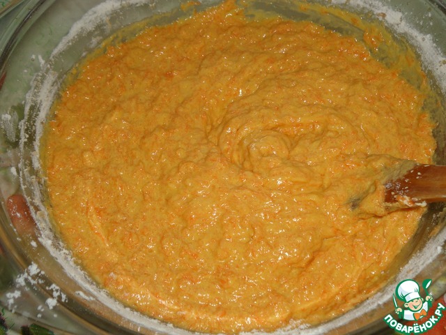 Добавить растопленное сливочное масло, соль, ванилин, разрыхлитель, морковь и постепенно добавить просеянную муку, замесить тесто, сметанообразной консистенции.