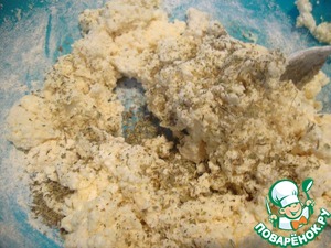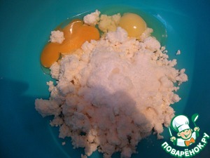 Творог, яйца, сахар, соль, разрыхлитель растереть в однородную массу.