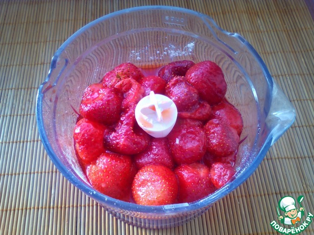 Сахарную пудру и клубнику поместить в чашу блендера.