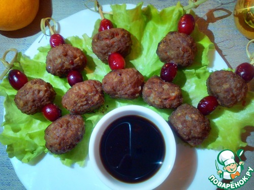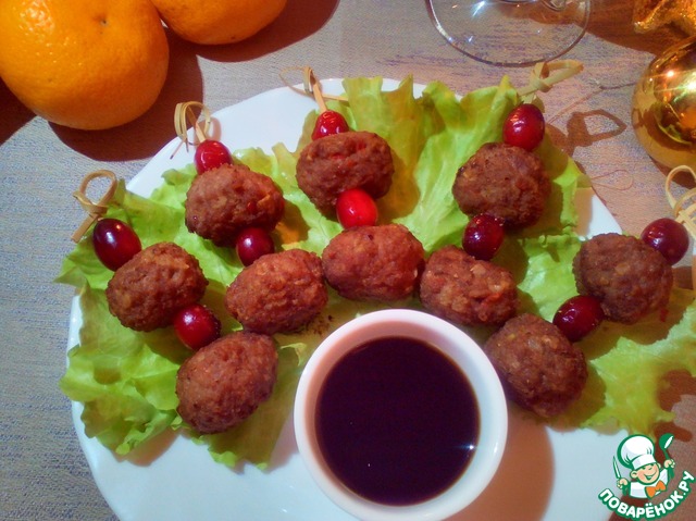 Нанизать котлетки на шпажки с клюквой. Подавать с любимым соусом. Приятного аппетита!