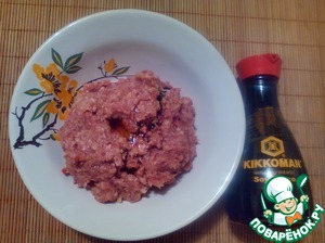 Лук и чеснок мелко порезать, добавить в фарш, перемешать. Влить соевый соус (ТМ Киккоман), добавить манку и яйцо, хорошо вымесить.