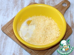 • 2. Замешиваем одновременно: яйцо, сливочное масло, кефир (гасим в нем соду), просеянную муку и сыр.