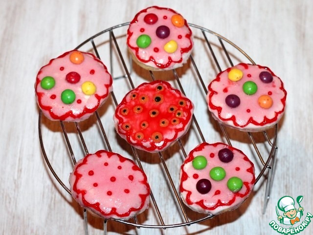 Отличное печенье.Нежное с лёгким сырным послевкусием.Тесто послушное,держит форму,поднялось равномерно.Готовилось в духовке всего то 6 минуточек,получилось 22 сердечка и 1 весёлая мордашка.Вместо кефира использовала молоко и соду гасила.Глазурь готовила с яблочным соком вместо лимонного получилось замечательно!Хорошая глазурь.Если рука дрогнула и где то не красиво ,то ещё есть время подправить. Украшать в дальнейшем по ней удобно!Вкусно с чаем и с кофе ,да и так с аппетитом!Спасибо Вам большое за рецепт!!!