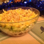 Новогодние салаты уже съедены, настала необходимость приготовить что-то новенькое. Вот и вспомнила про салат, который готовится всегда на наших корпоративах. Не собиралась выкладывать рецепт, но когда продегустировала то, что получилось... Ну как же это вкусно! Обычные продукты, но добавление чернослива вносит свою изюминку. Попробуйте, может, и вам понравится. Не судите строго, это первый рецепт, который я выкладываю.