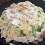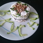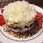 5 слой. Потереть сыр, сверху майонез. Я добавила немного измельченных грецких орехов.