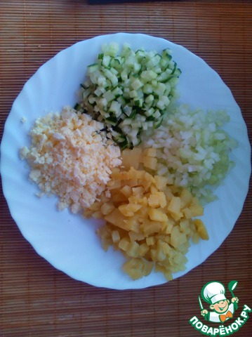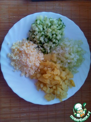 Картофель, огурец и сельдерей нарезать мелкими кубиками.