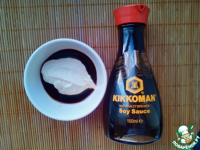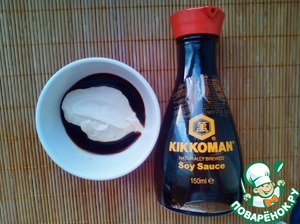 Майонез и соевый соус (ТМ Киккоман) смешать.