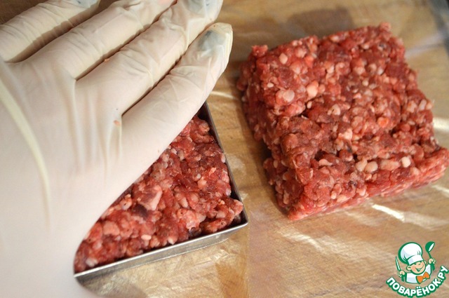 • Бургеры у меня не классической формы, так как булочки тоже прямоугольные. Выкладываем фарш в них чуть приминая сверху, только для придания формы. Ни в коем случае не трамбовать, не прижимать!!!