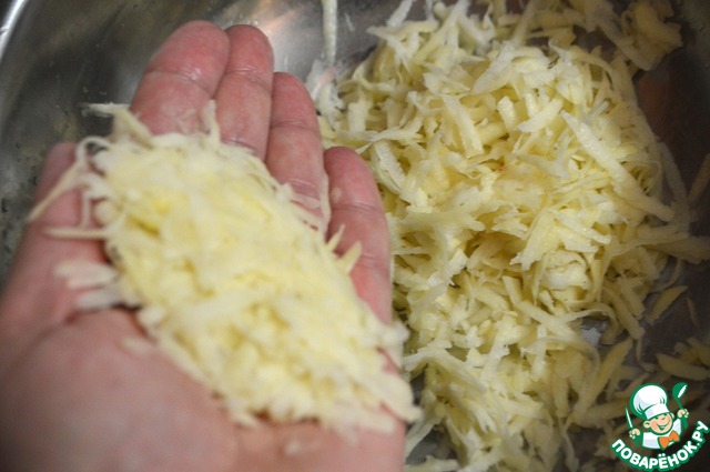 • Тем временем подготовим картофель. Натереть на крупной терке, зальем водичкой холодной и присолим по вкусу. А знаете зачем? Картофель просолится и отдаст лишний крахмал и часть калорий воде