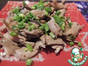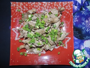 Остужаем грибы прямо в маринаде. Процеживаем. И можно подавать с зеленым лучком и растительным маслом