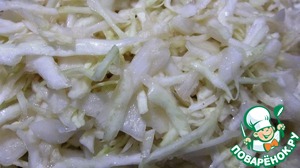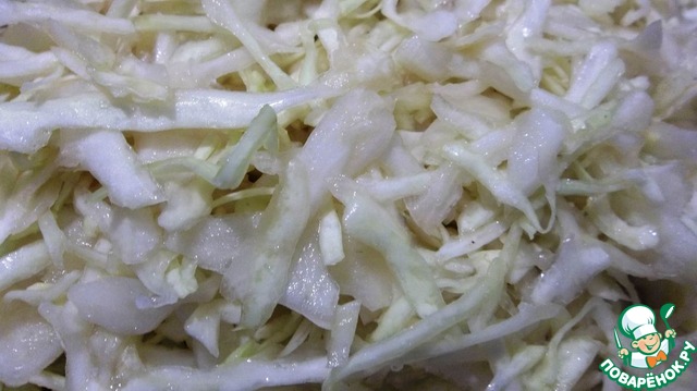 Нашинковать тонко капусту, сбрызнуть растительным маслом, бальзамиком, добавить соль и сахар, помять руками и оставить на 10 минут.