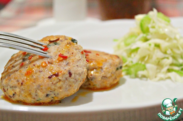 Соус чили размешать с 4 ст. л. воды и полить котлеты, накрыть крышкой и немного притушить.