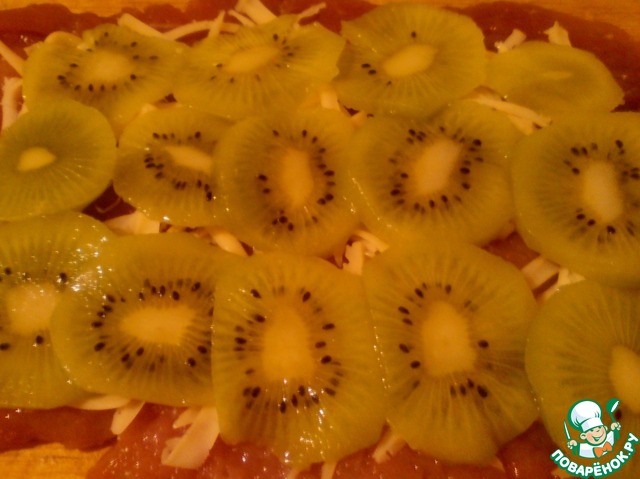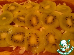 Киви очистить, тонко порезать, выложить на слой сыра.