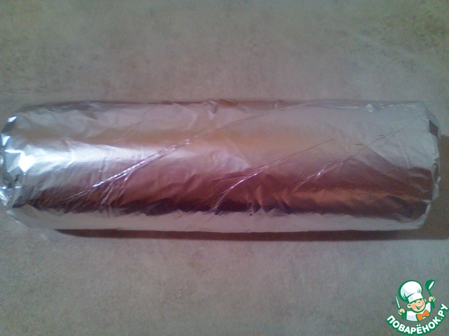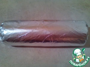 Свернуть рулет, обернуть плотно фольгой. Духовку разогреть до 200 градусов. Запекать 40 минут.