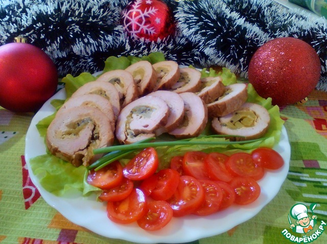Нарезаем готовый рулет порционными кусочками и подаем к столу. Можно подавать как горячую или холодную закуску.