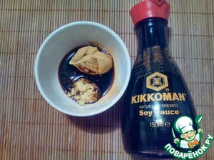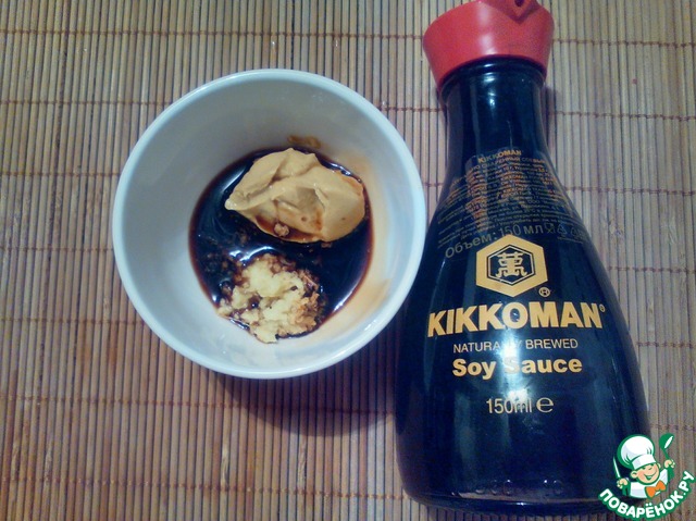 Смешать натертый имбирь, горчицу и соевый соус (ТМ Киккоман).