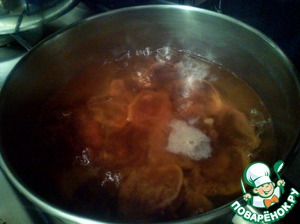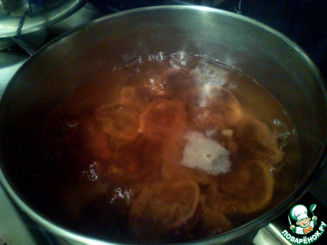 Курагу залить кипятком. Оставить на 5 минут. Воду слить.