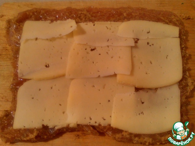 Сыр нарезать тонкими ломтиками. Выложить на филе.