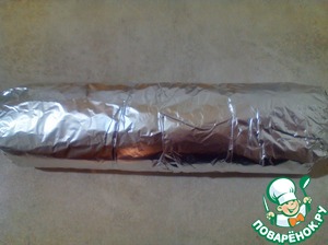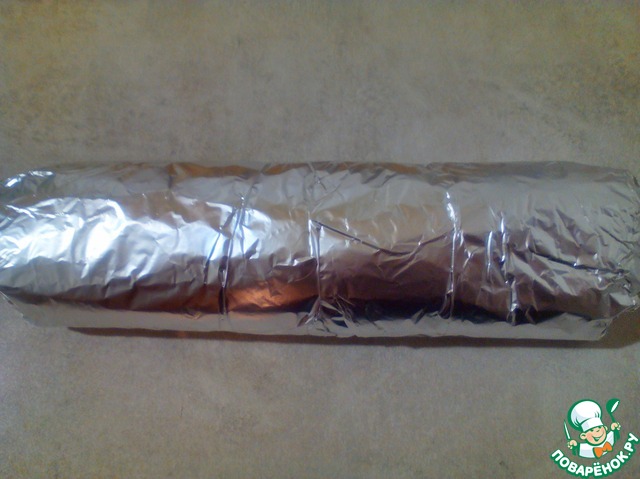 Свернуть плотно рулетом. Обернуть в два слоя фольги. Духовку разогреть до 200 градусов. Запекать 40 минут.