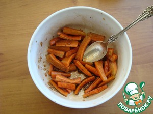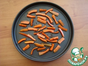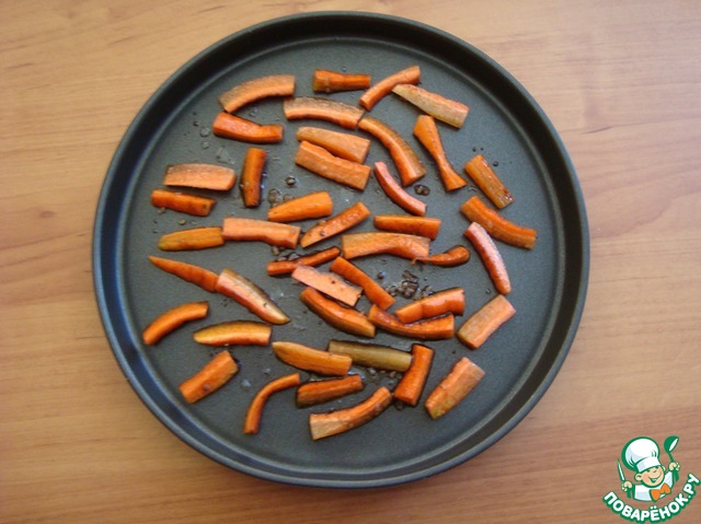 Выкладываем брусочки моркови на застеленный бумагой противень или как я-на антипригарную форму. Ставим в разогретую духовку до 220 С на минут 20. Ориентируйтесь по своей духовке.