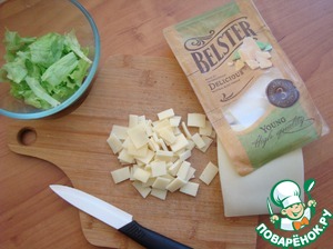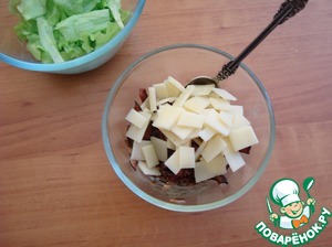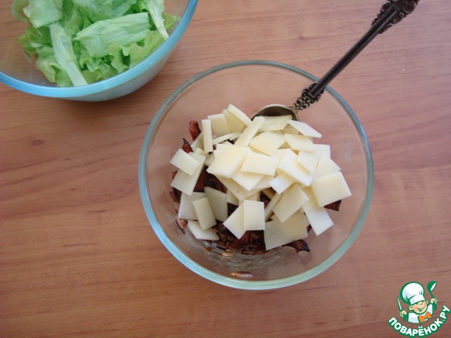 Салатные листья моем и обсушиваем, рвём руками, выкладывая в салатник. Сыр режем кубиками. Я порезала 3 пластины. Сыр купила в нарезке, если сыр куском, то кубики будут ещё лучше. До чего же вкусный сыр, самый настоящий! Замечательный!