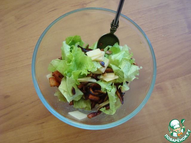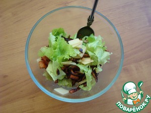 Отправляем всё к салатным листьям, добавляем оставшуюся заправку и перемешиваем.